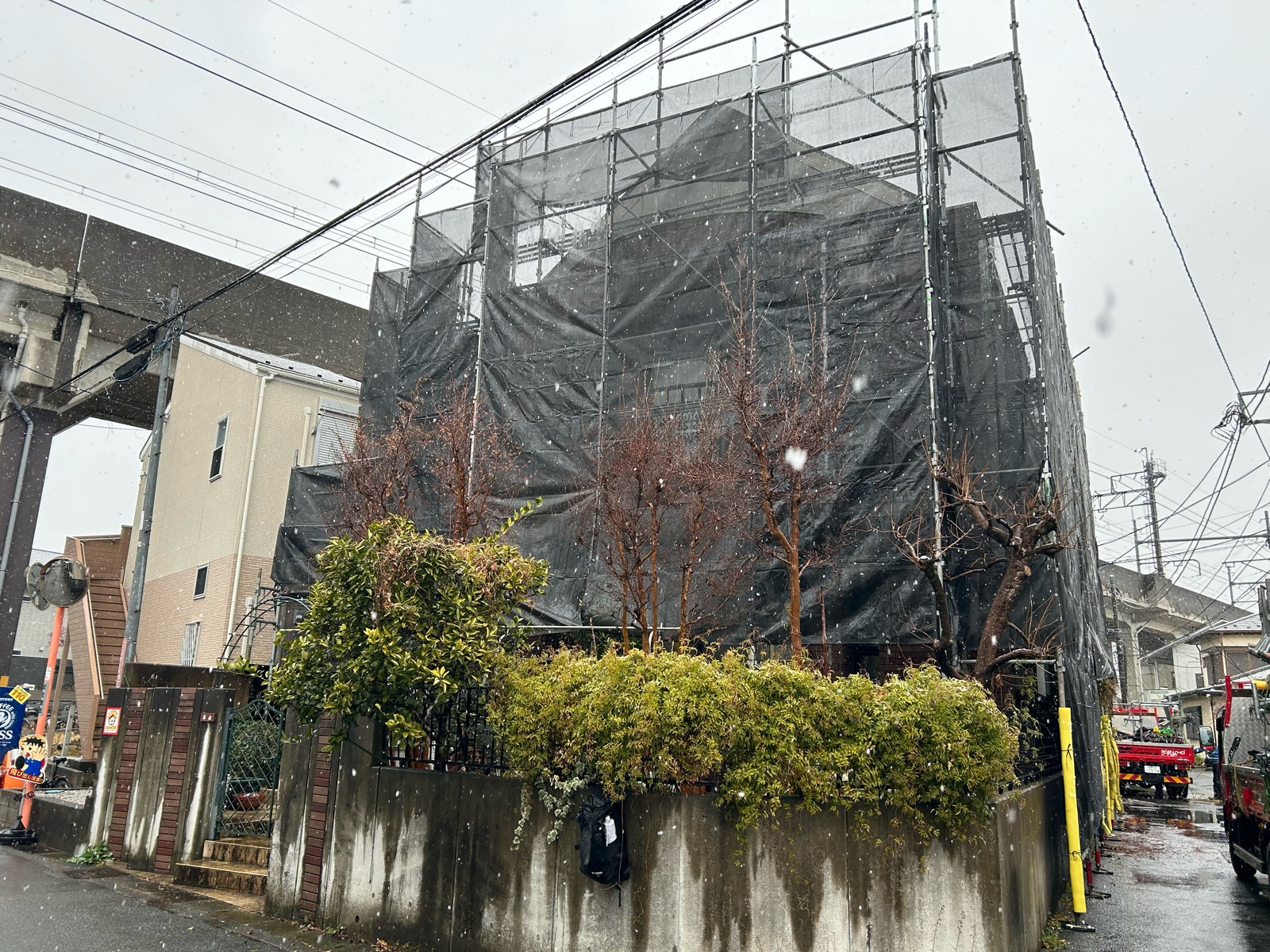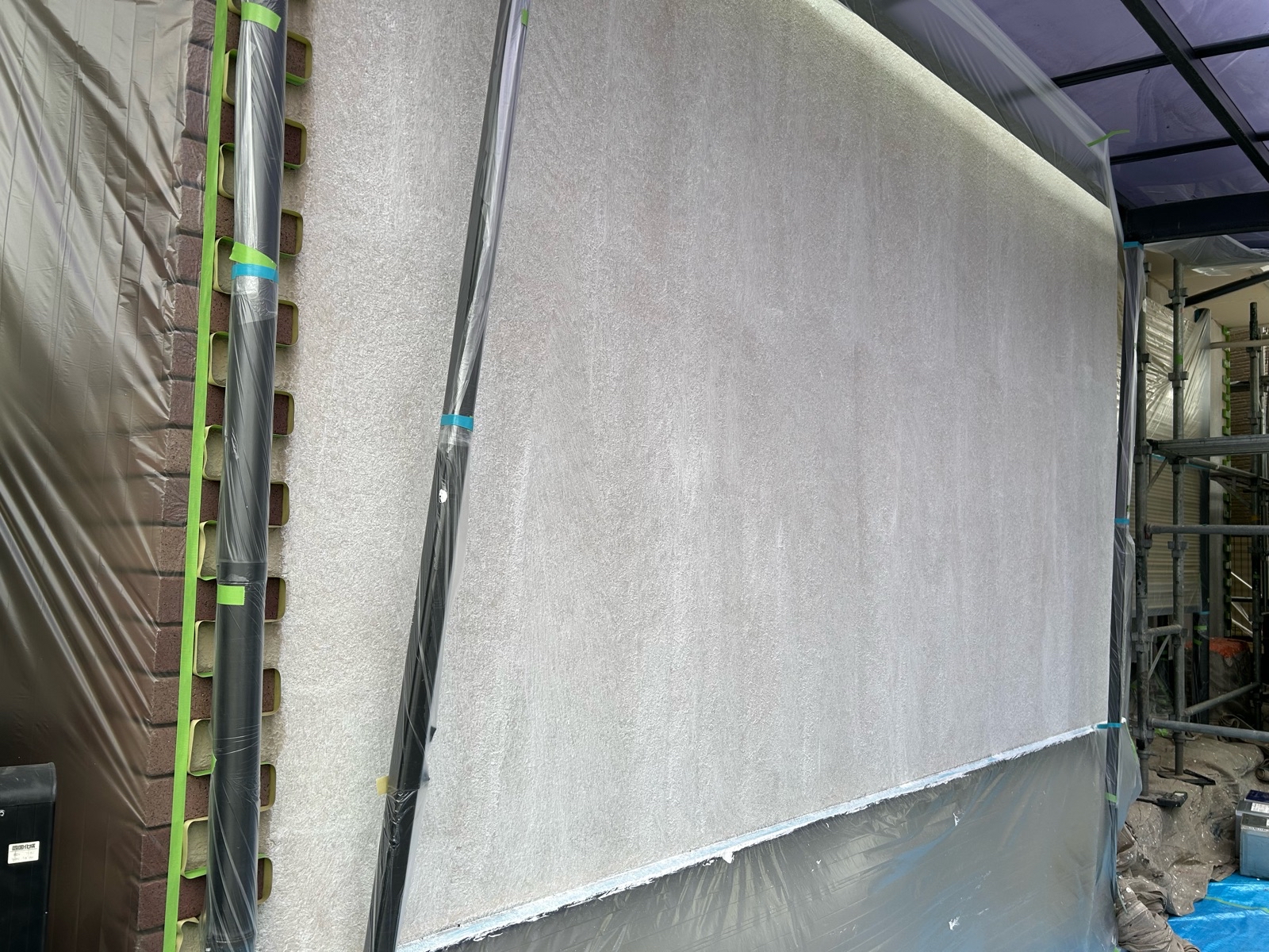 仮設工事:足場組立後飛散防止ネットをします。